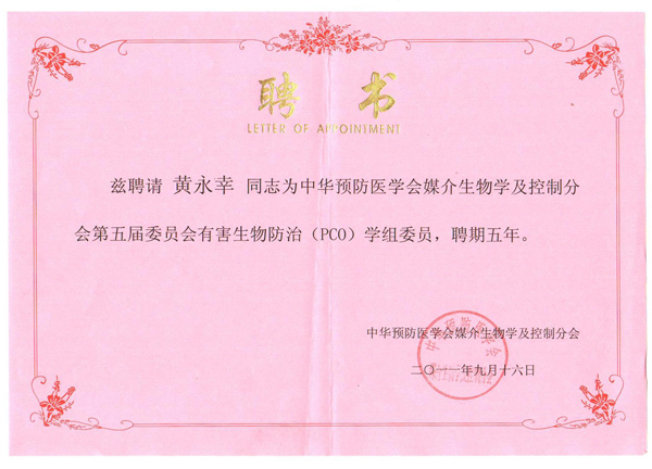 2011年9月16日公司總經(jīng)理黃永幸先生當選中華預防醫(yī)學會媒介生物學及控制分會第五屆委員會有害生物防治(PCO)學組委員。