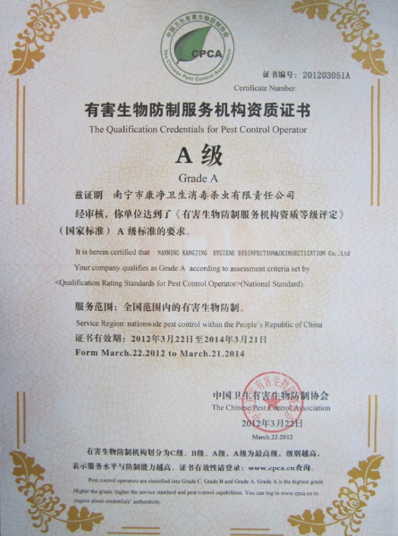 2012年3月21日-24日,中國(guó)衛(wèi)生有害生物防制協(xié)會(huì)2012年年會(huì)暨第四屆三次理事會(huì)在六朝古都南京市隆重召開(kāi),康凈公司被授予“中國(guó)有害生物防制服務(wù)機(jī)構(gòu)資質(zhì)A級(jí)證書(shū)”。年會(huì)是我國(guó)有害生物防制行業(yè)界最具規(guī)模與影響力的年度盛會(huì),屆時(shí),全國(guó)協(xié)會(huì)及會(huì)員單位、外國(guó)協(xié)會(huì)、省市地方協(xié)會(huì)(港臺(tái)協(xié)會(huì))、愛(ài)衛(wèi)系統(tǒng)、疾控系統(tǒng)、科研院校、藥械生產(chǎn)與經(jīng)營(yíng)企業(yè)、PCO企業(yè)等有關(guān)人士齊聚一堂,本次會(huì)議以“除四害與愛(ài)國(guó)衛(wèi)生運(yùn)動(dòng)——紀(jì)念?lèi)?ài)國(guó)衛(wèi)生運(yùn)動(dòng)開(kāi)展60周年”為主題,并對(duì)2011年通過(guò)A級(jí)資質(zhì)考評(píng)的全國(guó)10家PCO公司正式頒發(fā)資質(zhì)證書(shū)。圖為(中國(guó)衛(wèi)生有害生物防制協(xié)會(huì))秘書(shū)長(zhǎng)楊華林先生、(歐洲有害生物管理業(yè)協(xié)會(huì))總干事Rob Fryatt 先生作報(bào)告,及頒發(fā)證書(shū)現(xiàn)場(chǎng)。
